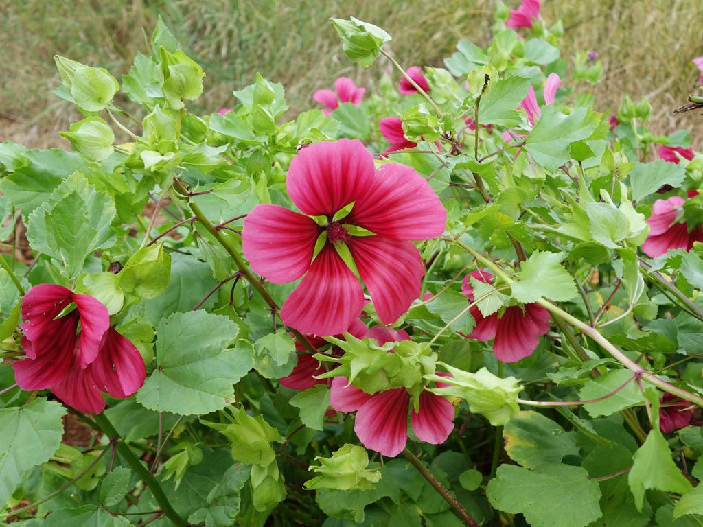 Sommerstokkrose i blandede farger i rødt, rosa og hvitt. For det meste er det mørkerosa blomster.