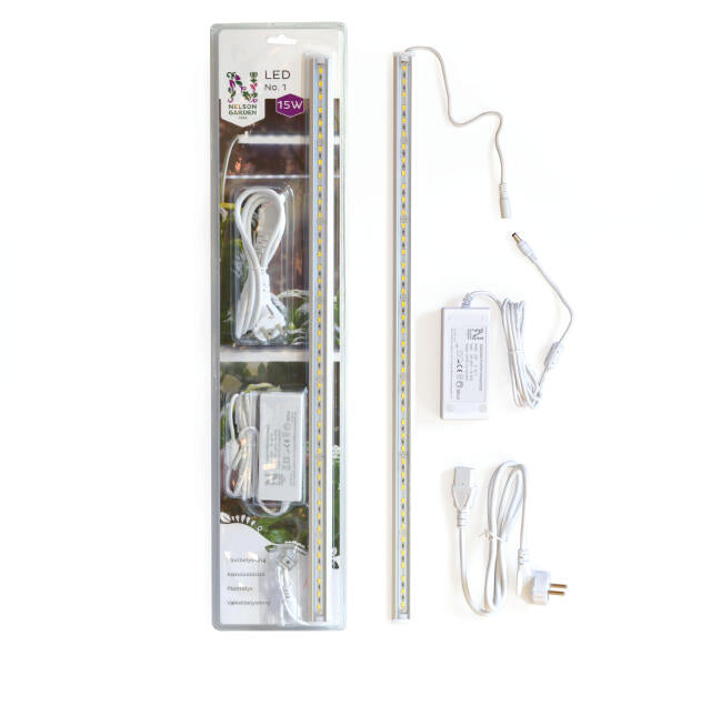 Energibesparende LED-lyslist uten adapter, for sammenkobling med LED No.1, art.nr. 5566. Passer til forkultivering og som ekstralys ved innedyrking. Lengde 60 cm, 15 W, 230 V, 6400 K, nominell lysstyrke 1500 lumen, nominell brenntid 35000 h, PPFD (100 mm) 115 µmol/s/m².