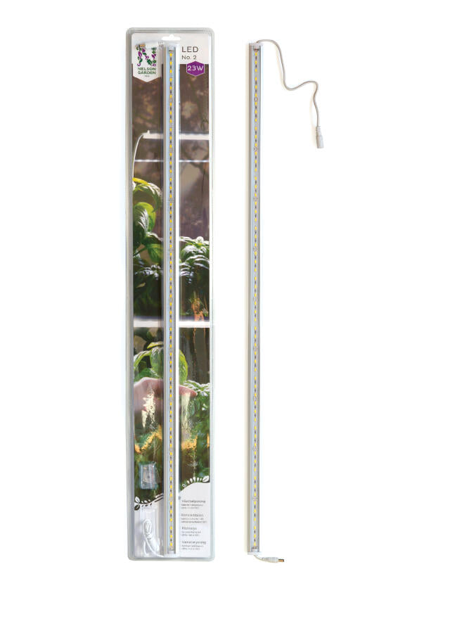 Energibesparende LED-lyslist uten adapter, for sammenkobling med LED No.1, art.nr. 5567. Passer til forkultivering og som ekstralys ved innedyrking. Lengde 85 cm, 23 W, 230 V, 6400 K, nominell lysstyrke 2200 lumen, nominell brenntid 35000 h, PPFD (100 mm) 141 µmol/s/m².