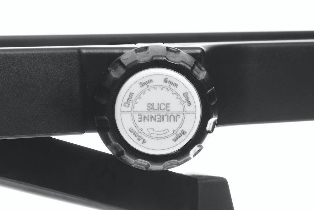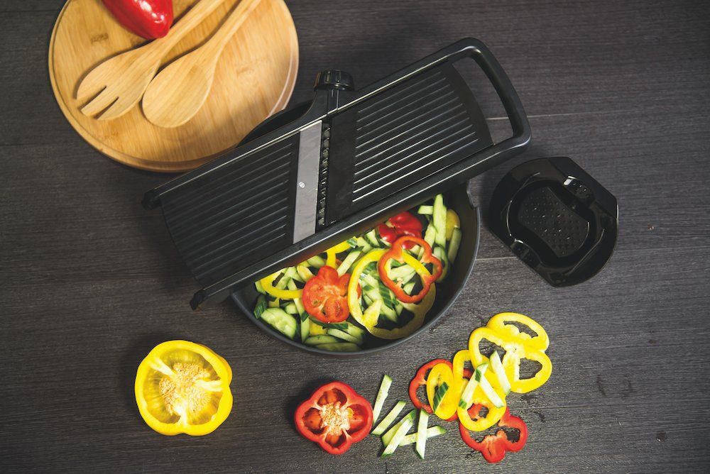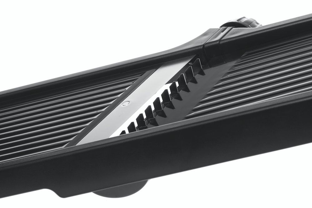 En skarp mandolin gjør det raskt og enkelt å skjære mat. Denne mandolinen har et integrert blad, to stående blader og en skjæreskive som kan justeres til ønsket tykkelse.