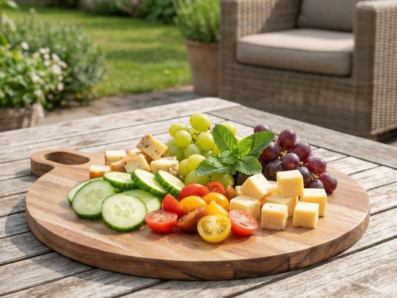 Rundt serveringsbrett i akasietre, perfekt til ost, bær, antipasti, med mer. Med jevnlig vedlikehold holder det seg pent lenge.