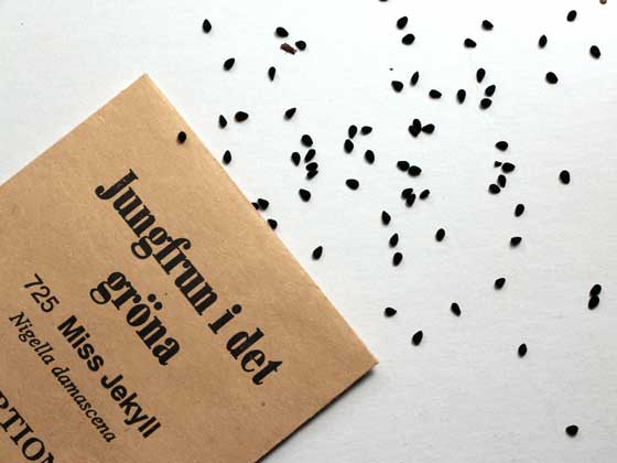 Jomfruen i det grønne, også kjent som Miss Jekyll, er en ettårig sommerblomst som blomstrer fra juni til september. Den har blå blomster og en dekorativ frøstand som kan brukes til snitt og tørking. Sneglene er ikke så veldig glade i denne.