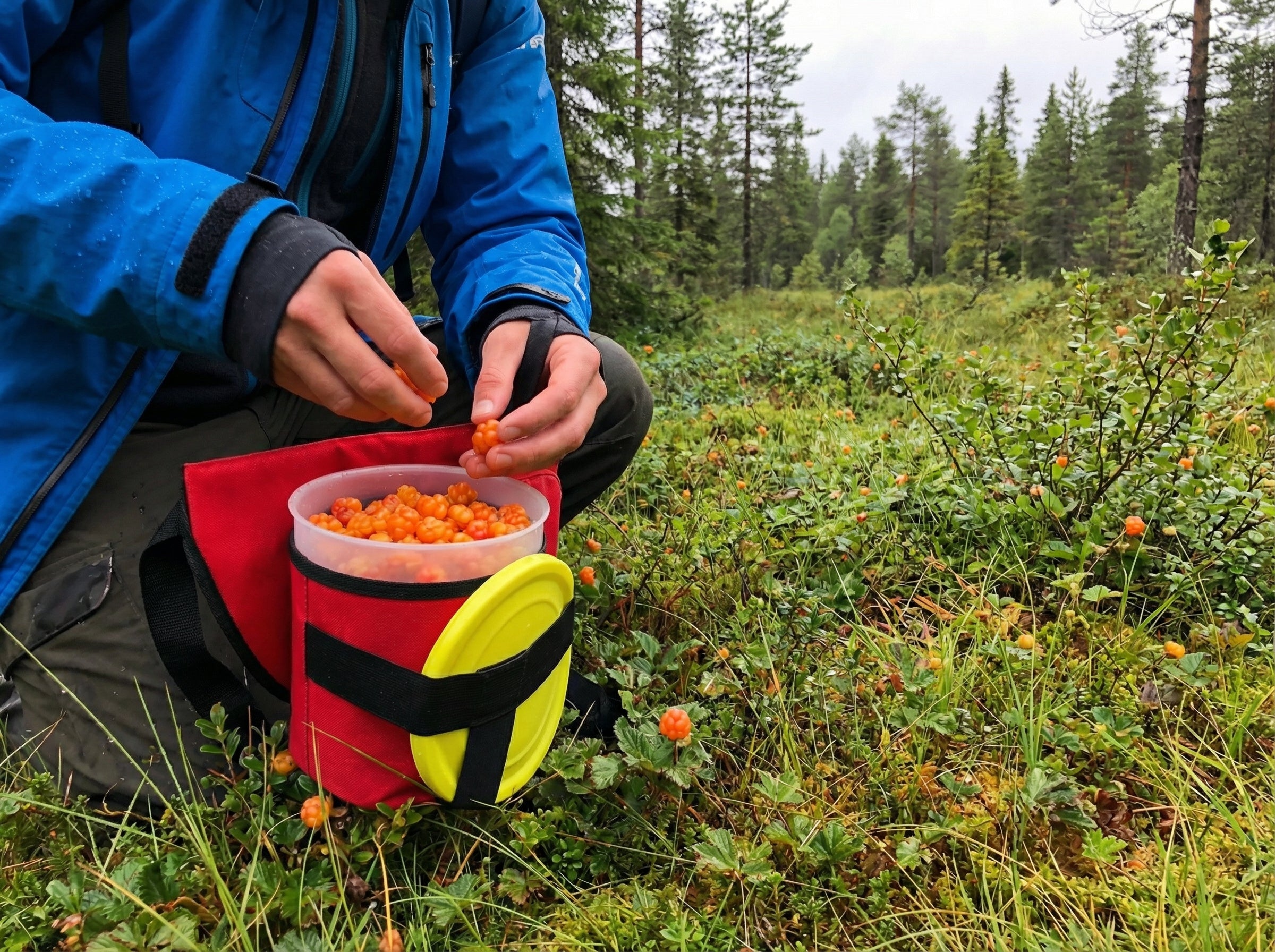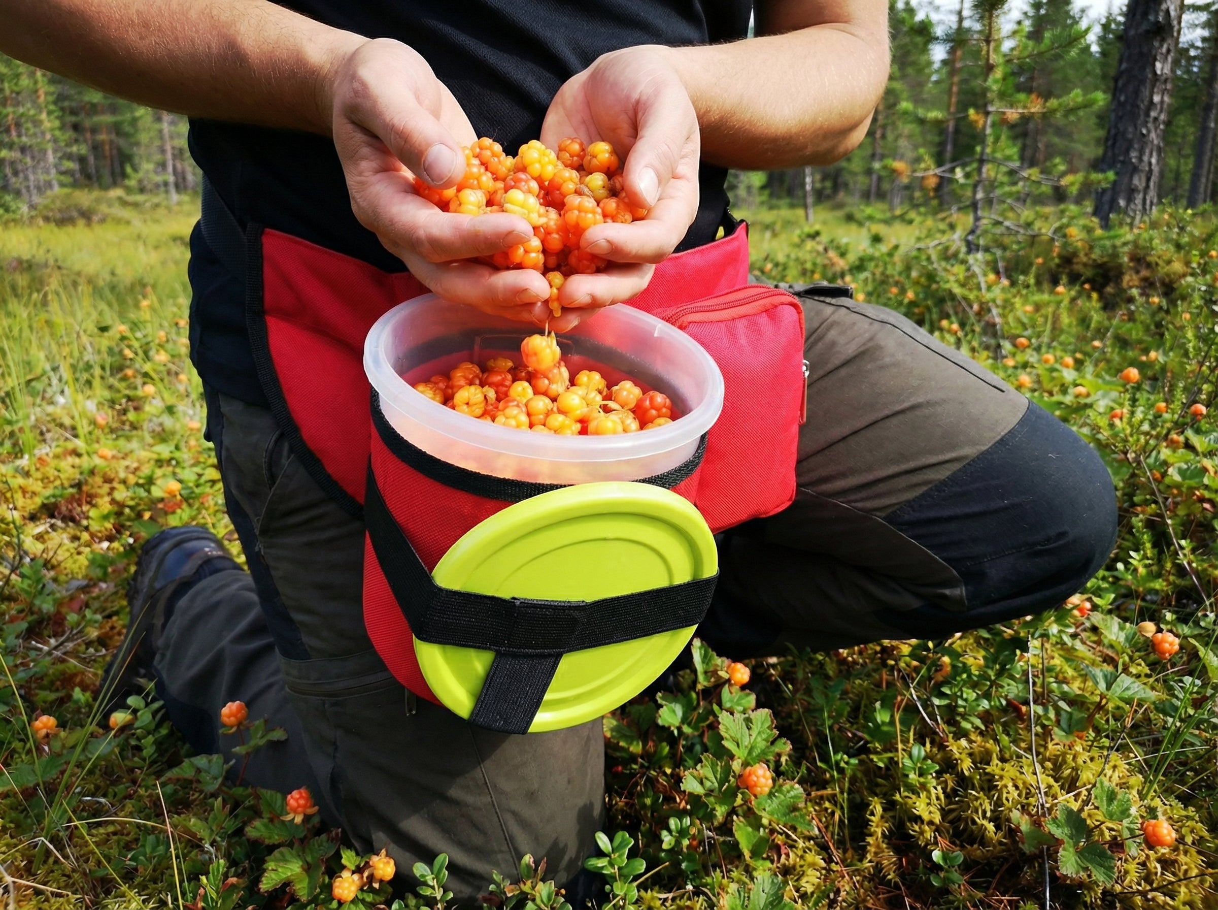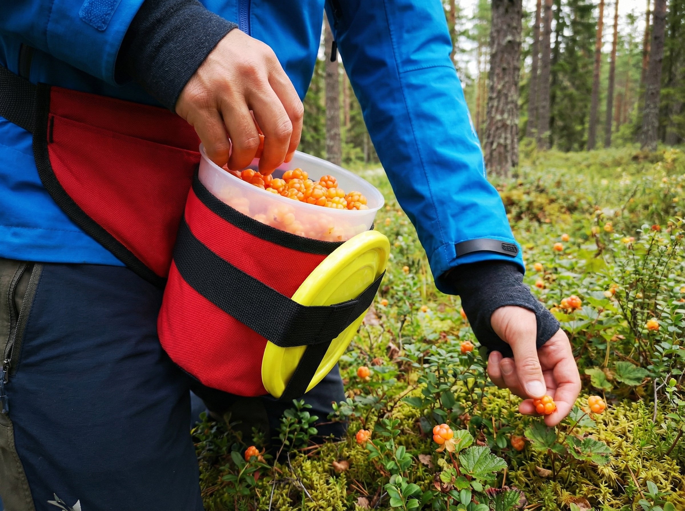 Gjør det lettvint å plukke bær, bøtta henger fast rundt livet så det er bare å putte oppi.