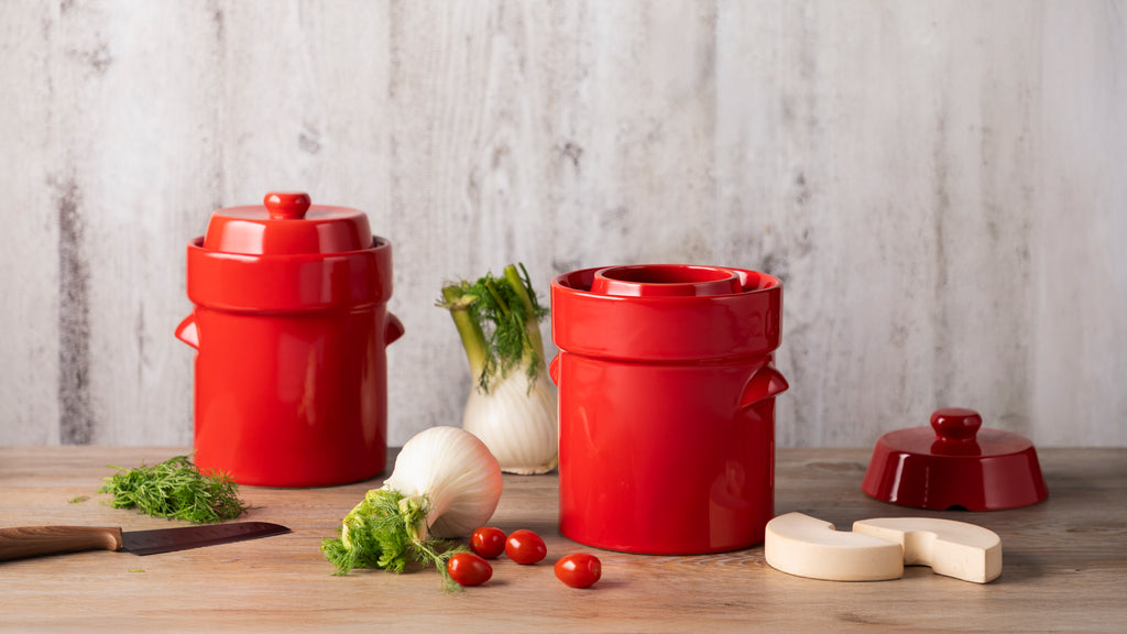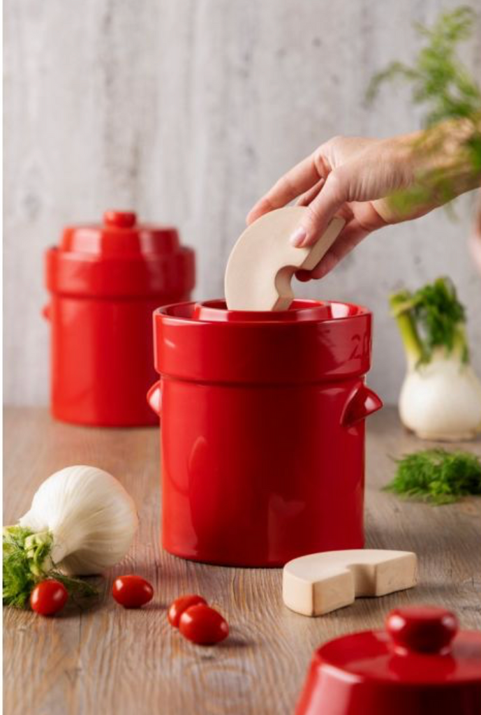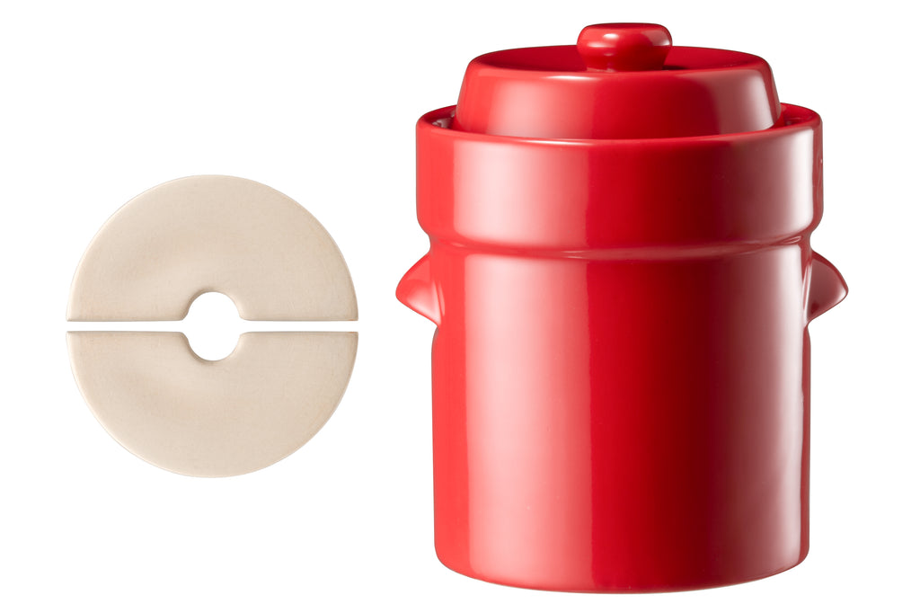 Dette stilrene keramiske fermenteringssettet lar deg enkelt lage egne fermenterte og syltede grønnsaker – helt uten plast! Krukken har et tidløst design som gjør at den ser like fin ut på kjøkkenbenken som i skapet.